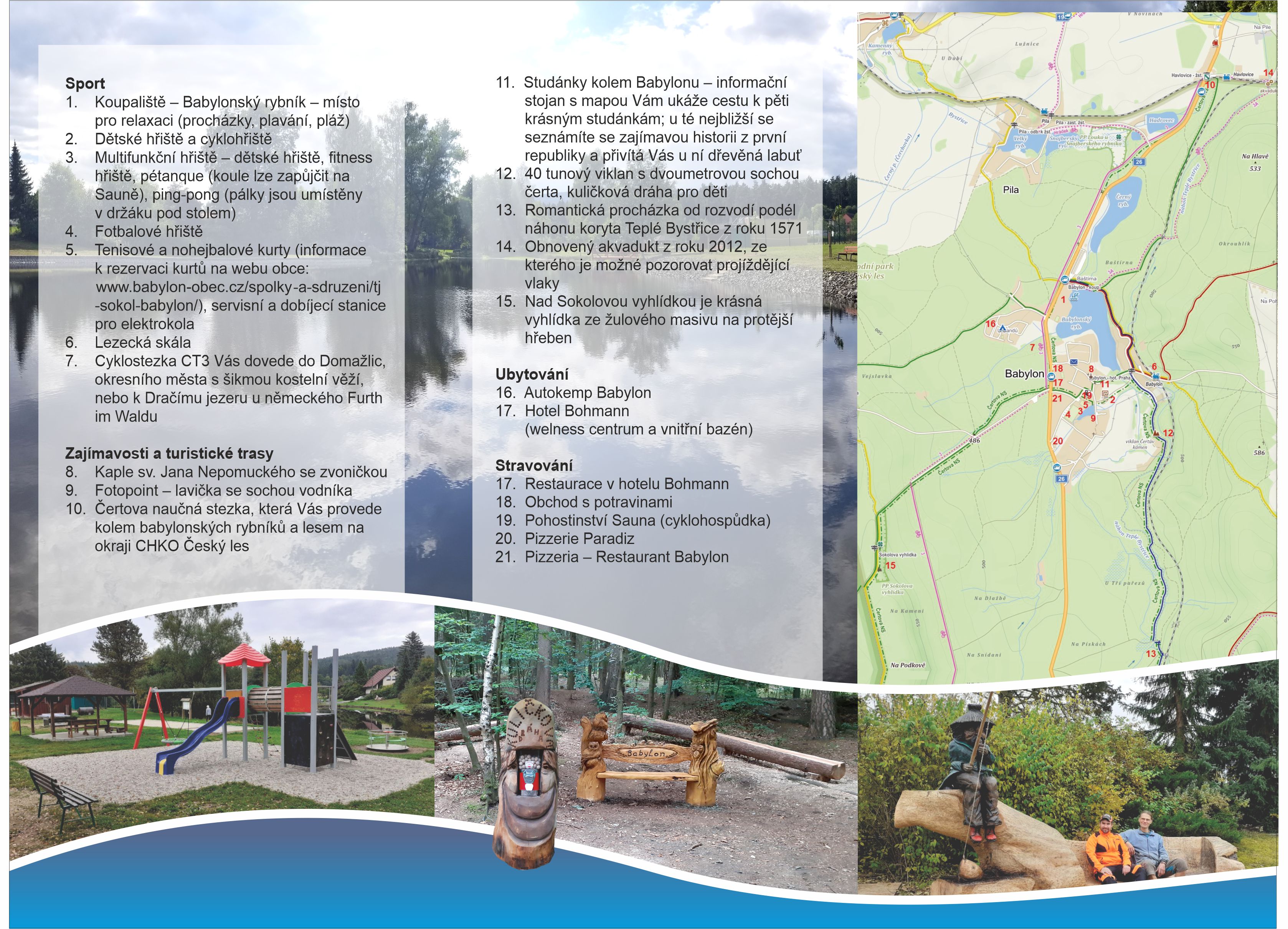 The 11 km long Devil's Nature Trail ( Download the guide here ) runs through the surroundings of Babylon and the village itself . It has 21 stops and is suitable mainly for walking or mountain biking. It starts in the village of Havlovice - Hadrovec near the aqueduct. It runs past the Black Pond, which is currently used for fish farming.